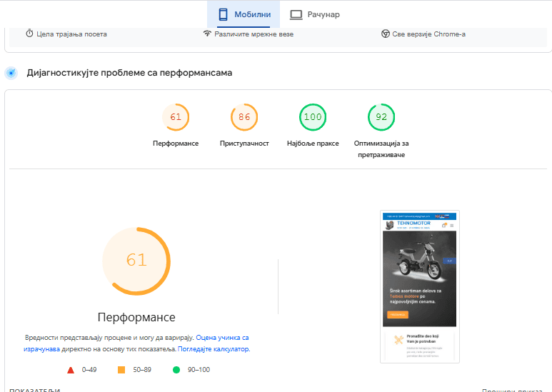PageSpeed je bio oko 61/100 na mobilnom i 69 od 100 na desktopu, iako je sajt tehnički ispravan i na dobrom hostingu.